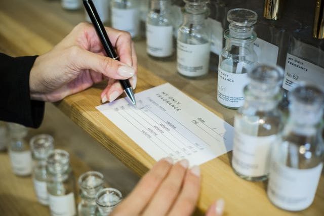 体験の流れは、まず直感で好きな香りを選ぶことからスタート。その後、香りの種類やブレンド量を調整しながら、アドバイザーと一緒に理想の香水を完成させていきます。これまで数千人以上のフレグランスを調合してきた実績をもとに、香りの系統や印象、バランスをアドバイスしてくれるため、初心者でも安心です。