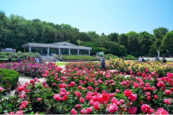 神代植物公園の中でも特に人気なのが「バラ園」。約400品種・5,000株のバラが咲き誇り、春(5月〜6月)と秋(10月〜11月)の見頃には多くの人でにぎわいます。