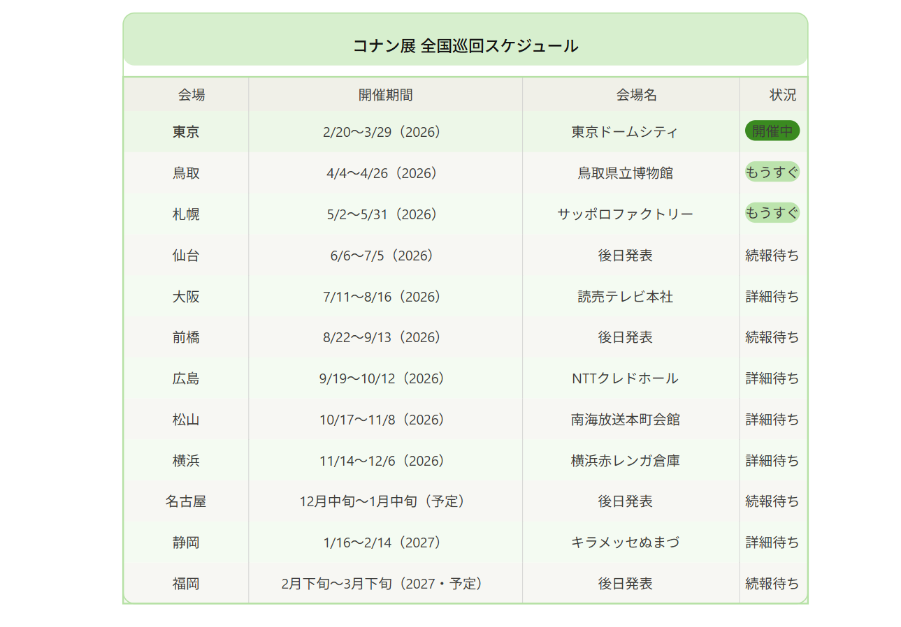 コナン展は全国12都市を巡回するイベントです。現時点で公式サイトに詳細情報が公開されている東京・鳥取・札幌の3会場を、それぞれ詳しくご紹介します。
